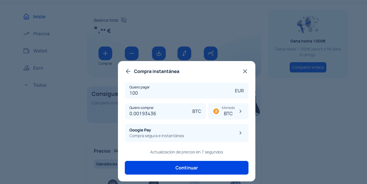 Una vez has elegido comprar BTC, el siguiente paso es indicar la cantidad en Euros (o en la divisa con la que operes) que quieres comprar. En este ejemplo, hemos decidido comprar 100€, los cuales automáticamente se convertirán en BTC para que conozcas la cantidad de bitcoin que recibirás al terminar la transacción.